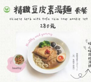 蔬菜熬製出的清甜湯底,搭配淡淡的藥膳香氣。配上軟嫩口感的生豆皮與香氣十足的香菇,素食也能好飽足。